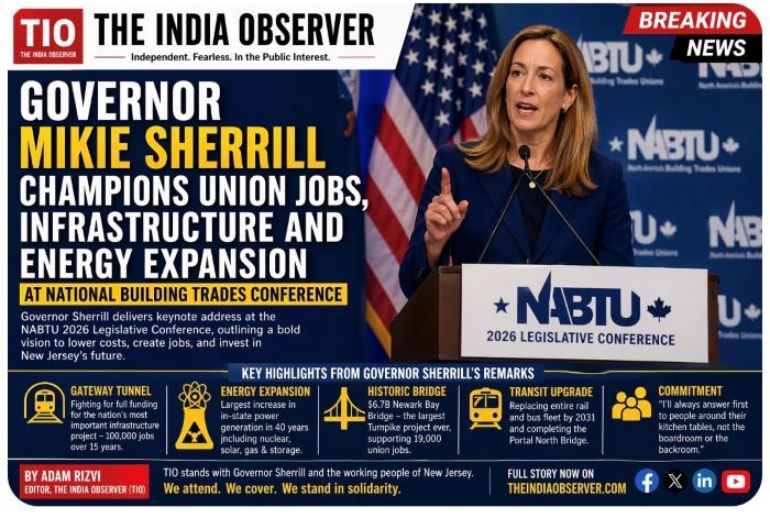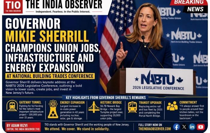 By Adam Rizvi | Editor, The India Observer (TIO): WASHINGTON, D.C. — Mikie Sherrill, Governor of New Jersey, delivered a forceful message in support of organized labor, infrastructure investment, and working families while addressing the North America’s Building Trades Unions (NABTU) 2026 Legislative Conference in Washington, D.C.