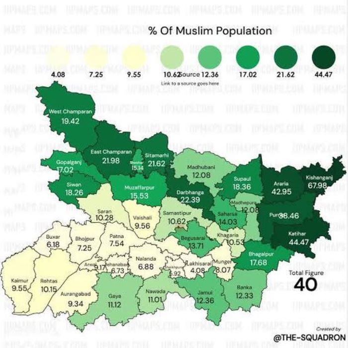 Here, an attempt is made to map out Muslim assembly constituencies in Bihar. This is done by pulling out the data from the 2011 census. It is assumed that the decadal population growth has pushed the percentage of Muslims in each constituency much higher than it was in 2011. Here is the list of the 243 assembly constituencies in the 38 districts of Bihar, where the percentage of Muslims is listed in descending order.